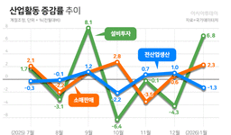 반도체 생산 감소 영향에 새해 첫 달 산업 생산이 1.3% 감소했다. 지난해 10월 이후 3개월 만에 하락 전환이다. 반면 소비와 설비투자는 각각 2.3%, 6.8% 증가했다. 건설기성은 11.3% 급감하며 14년 만에 가장 큰 폭으로 줄었다. 국가데이터처는 4일 발표한 '1월 산업활동동향'에 따르면 1월 전산업생산 전달보다 1.3% 줄었다. 산업생산은 작년 11월(0.7%), 12월(1.0%) 두 달 연속 증가했지만 새해 들어 하락하며 석 달 만에 감소세로 돌아섰다. 광공업생산이 1.9% 감소했다. 전자부품(6.5%)이 늘었지만..