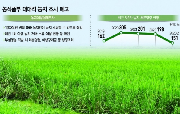 이재명 대통령이 국내 농지가 투기 대상이 됐다며 전수조사를 주문한 가운데 농림축산식품부가 부실영농 여부에 대한 대대적인 실태점검에 나설 전망이다.4일 농식품부에 따르면 농지 소유자에 대한 실경작 여부 등을 조사하기 위한 계획이 내부검토 중인 것으로 확인됐다. 조사 대상·방법·범위 등을 담은 구체적인 점검방안은 이르면 이달 중 발표될 예정이다.농식품부 관계자는 "모든 농지에 대해 전수조사를 진행할 것인지 (방법론을) 내부적으로 정리하고 있는 단계"라며 "실경작 여부뿐만 아니라 다양한 농지 관련 정보를 실무적으로 어디까지 확인해야 할지..