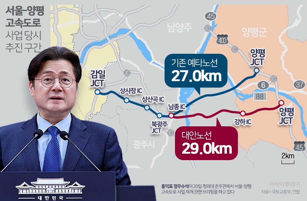 이재명 대통령이 3년 가까이 중단됐던 서울-양평고속도로 사업 재개를 지시했다. 정부는 오는 2029년 착공을 목표로 사업을 다시 추진할 방침이다. 홍익표 청와대 정무수석은 20일 춘추관 브리핑에서 "대통령 지시에 따라 2023년 7월 이후 중단된 서울-양평고속도로 사업을 재개하기로 했다"고 밝혔다. 서울-양평고속도로는 경기도 하남시에서 양평군을 연결하는 왕복 4차로 도로로, 수도권 동부 지역 간선 기능 강화와 지역 균형 발전을 위한 핵심 교통 인프라 사업이다. 해당 사업은 2017년 고속도로 건설 계획에 반영된 뒤 2021년 예비타당성 조사를 통과하며 추진됐으나, 윤석열 대통령 당선 이후 부인 김건희 씨 일가 토지 인근으로 종점 노선을 변경하는 과정에서 특혜 의혹이 제기됐다. 이후 2023년 종점이 양서면에서 강상면으로 바뀌면서 논란이 확산됐고, 같은 해 7월부터 사업은 사실상 중단됐다. 청와대는 사업 재개 배경으로 교통 혼잡 해소와 지역 수요를 들었다. 홍 수석은 "출퇴근과..
