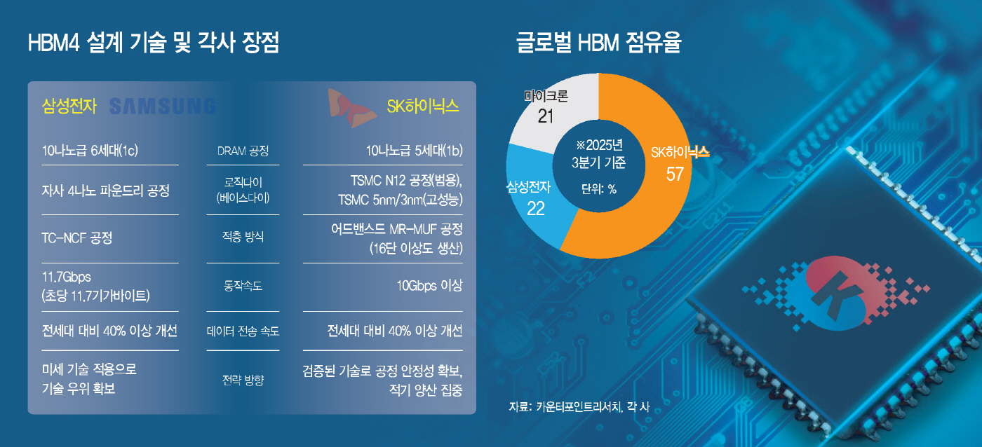 점유율 57%로 SK하이닉스가 압도하는 고대역폭메모리(HBM) 시장에서 22%로 상대적 열세인 삼성이 엔비디아가 요구하는 기술적 허들을 넘고 6세대 HBM4를 먼저 제공할 수 있을까. AI 반도체로 불리는 HBM의 차세대 시장을 놓고 벌이는 쟁탈전 윤곽이 이번주 실적발표와 함께 공개될 것으로 보인다. 26일 로이터 등 주요 외신에 따르면 삼성전자는 다음 달 HBM4 생산을 시작해 엔비디아에 공급할 것으로 보인다. 전문가들은 삼성이 엔비디아의 까다로운 퀄테스트(품질 인증)를 먼저 통과한다면 점유율 격차를 좁히고 확실한 반등의 계기가..