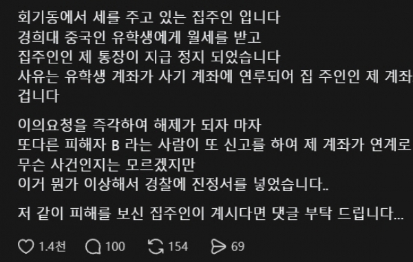 서울 동대문구 회기동에서 월세를 받던 집주인이 세입자인 중국인 유학생과 관련된 사기 사건에 연루되면서 본인 계좌까지 지급정지됐다는 사연이 온라인에서 확산되고 있다. 최근 한 온라인 이용자는 자신의 쓰레드 계정에 "경희대 중국인 유학생에게 월세를 받았는데 집주인인 제 통장이 지급정지됐다"는 글을 올렸다. 작성자는 "이유를 확인해 보니 유학생 계좌가 사기 계좌와 연루됐고, 그 계좌로 월세를 받은 제 계좌도 연계 계좌로 묶였다는 설명을 들었다"고 밝혔다. 그는 "즉시 이의 신청을 해 계좌가 풀렸지만, 또 다른 피해자가 신고하면서 다시..