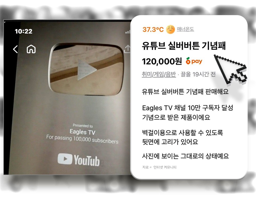 프로야구 구단 한화 이글스의 공식 유튜브 채널 '이글스TV'가 구독자 10만 명 돌파로 받은 실버버튼 기념패가 중고 거래 플랫폼에 등장했다가 삭제된 사실이 알려졌다. 최근 온라인 커뮤니티에는 이글스TV의 유튜브 실버버튼 기념패가 당근마켓에 올라왔다는 게시글이 확산됐다. 해당 판매글에는 "벽걸이용으로 사용할 수 있도록 뒷면에 고리가 있다. 사진 그대로의 상태"라는 설명이 담겼으며, 초기 12만 원이던 가격은 이후 15만 원으로 인상된 뒤 예약 상태로 전환된 것으로 전해졌다. 현재 해당 게시글은 삭제된 상태다. 문제는 이 기념패가..
