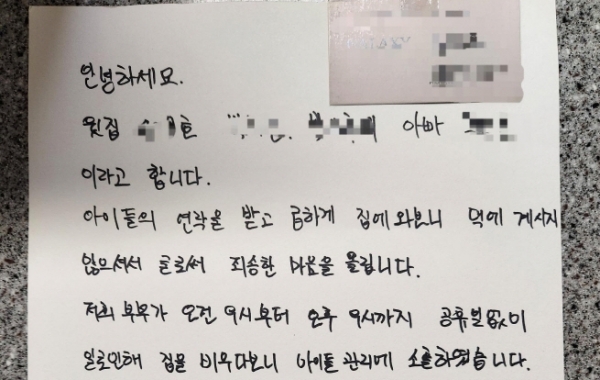 최근 층간소음이 사회적 문제로 대두되고 있다. 이런 가운데 한 아빠가 아이들과 직접 사과하고 반성문을 전달해 이웃과의 관계를 원만히 회복한 사례가 전해졌다. 최근 인터넷 커뮤니티에서는 한 남성이 층간소음 문제를 해결한 방법을 쓴 글이 뒤늦게 인기를 모으고 있다. A씨는 지난해 3월 3일, 가게에서 일하던 중 아이들로부터 "아랫집 할머니가 층간소음 문제로 찾아오셨다"는 전화를 받았다. 그는 평소 아이들에게 주의를 주고 층간소음 방지 슬리퍼를 신기기도 했지만, 아이들만 집에 있었던 상황에서 소파에서 뛰는 등의 행동이 있었던 것으로..