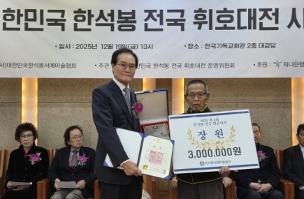 '2025 대한민국 한석봉 전국 휘호대전' 시상식이 19일 서울 종로구 한국기독교회관에서 개최됐다. 현장 심사를 통해 선정된 대상(장원) 수상자 이창희 작가(한문서예 부문)를 비롯해 차상(최우수상) 서정민(한문서예)·정원요(한글서예)·박수연(캘리그래피) 작가 등 다수의 선정작 작가들이 이날 수상의 영예를 안았다. 장동석 (사)대한민국한석봉서예미술협회 이사장은 인사말에서 "석봉 선생의 학문과 도전 정신, 교과서적인 삶은 오늘을 살아가는 우리들에게 길잡이가 된다"며 "이를 모범적 표상으로 삼고 오래동안 기억해야 할 것"이라고 행사...