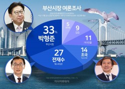 내년 6·3 지방선거를 앞두고 실시된 부산시장 여론조사에서 박형준 부산시장이 33%, 전재수 해양수산부 장관이 27%, 조국 조국혁신당 대표가 14%, 정이한 개혁신당 대변인이 1%를 기록했다. 박형준 부산시장이 오차범위 내 선두를 달리고 있으며 전재수 해수부 장관과 조국 대표가 그 뒤를 추격하는 것으로 나타났다.26일 한국여론평판연구소(KOPRA)가 자체적으로 지난 11월 22~23일 부산광역시 거주 만 18세 이상 남녀 1023명을 대..
