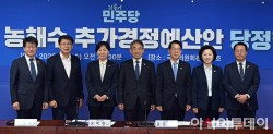윤준병 더불어민주당 농림축산식품해양수산위원회 정조위원장과 송미령 농림축산식품부 장관, 황종우 해양수산부 장관을 비롯한 농해수위 위원들이 1일 국회 의원회관에서 열린 2026 농해수 추가경정예산안 당정협의에 앞서 기념촬영을 하고 있다. 왼쪽부터 임호선·서삼석 의원, 송미령 장관, 윤준병 정조위원장, 황종우 장관, 송옥주·문금주 의원.