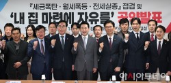 장동혁 국민의힘 대표(앞줄 왼쪽에서 네번째)와 송언석 원내대표(세번째), 정점식 정책위의장(두번째), 조정훈 의원(다섯번째) 등 참석자들이 1일 서울 마포구의 한 아파트 단지에서 열린 '세금폭탄·월세폭등·전세실종' 점검 및 '내 집 마련에 자유를' 공약 발표 간담회에 앞서 기념촬영을 하고 있다.