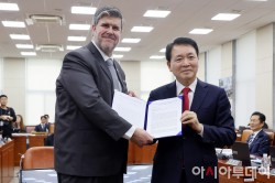 성일종 국회 국방위원장과 필립 라포르튠 주한 캐나다 대사가 24일 국회에서 열린 국방위원회 전체회의에서 대한민국과 캐나다간 국방·방산 협력 확대를 위한 결의안을 의결한 뒤 기념촬영을 하고 있다.
