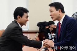 안규백 국방부 장관이 24일 국회에서 열린 국방위원회 전체회의에서 성일종 위원장과 인사를 나누고 있다.