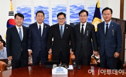 우원식 국회의장과 여야 원내대표가 13일 국회에서 열린 국회의장 주재 여야 원내대표 회동에서 기념촬영을 하고 있다. 왼쪽부터 더불어민주당 문진석 원내운영수석부대표·김병기 원내대표, 우원식 의장, 국민의힘 송언석 원내대표·유상범 원내운영수석부대표.