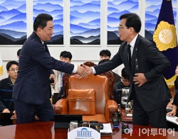 김병기 더불어민주당 원내대표(왼쪽)와 송언석 국민의힘 원내대표가 13일 국회에서 열린 국회의장 주재 여야 원내대표 회동에 앞서 인사를 나누고 있다.