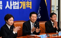 정청래 더불어민주당 대표와 한병도 원내대표 등이 25일 국회에서 열린 최고위원회의에서 '코스피 6000' 돌파를 축하하며 박수를 치고 있다.
