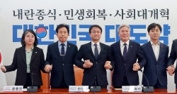 우원식 국회의장과 정청래 더불어민주당 대표, 조국 조국혁신당 대표, 김영록 전남지사, 강기정 광주시장, 이부영 자유언론실천재단 이사장을 비롯한 참석자들이 25일 국회의원회관에서 열린 5·18정신 헌법전문수록 개헌 촉구 국민결의대회에서 구호를 외치고 있다.