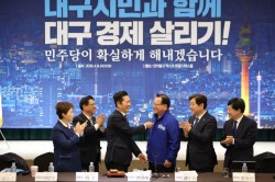 "김부겸이 원하는 건 다!"8일 오전 대구 북구 매천시장을 찾은 정청래 더불어민주당 대표가 상인들에게 건넨 말이다. "대구 좀 많이 도와주이소"라는 한 상인의 사투리 섞인 호소에 정 대표가 김부겸 대구시장 후보를 앞세운 거다. 또 다른 중년 여성 상인에게는 "김부겸, 이 양반 보니깐 어떻습니까"라며 옆에 있던 김 후보를 직접 인사시켜 주기도 했다. 이날 매천시장 방문부터 대구 현장 최고위원회의까지 민주당..