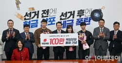 장동혁 국민의힘 대표와 지도부가 9일 국회에서 열린 '100만 책임당원 돌파 기념식'에서 책임당원들과 기념촬영을 하고 있다.
