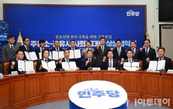 한병도 더불어민주당 원내대표와 민병덕 을지로위원장, 주병기 공정거래위원장, 안승배 한국주유소협회장, 국내 4대 정유사 관계자 등이 9일 국회에서 열린 주유소-정유사 사회적대화 상생협약식에서 협약서를 들고 기념 촬영을 하고 있다.