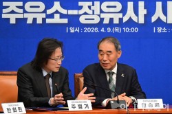 주병기 공정거래위원장과 안승배 한국주유소협회장이 9일 국회에서 열린 주유소-정유사 사회적대화 상생협약식에서 대화를 나누고 있다.