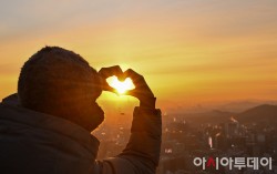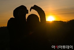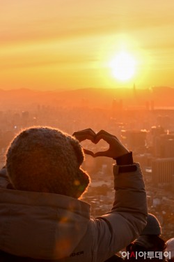 2026년 병오년(丙午年) 새해 첫날인 1일 오전 서울 인왕산에서 한 시민이 손가락 하트에 새해 첫 일출을 담고 있다. /정재훈 기자