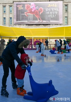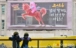 1일 서울 중구 서울도서관 외벽 서울꿈새김판에 '2026 같이 달려요, 더 건강한 서울로!'라는 문구가 새롭게 게시돼 있다. 서울시는 2026년 적마(赤馬)의 해를 맞아 시의 대표 캐릭터인 해치를 태운 말 한 마리가 서울도서관 창문 사이를 뛰어넘는 듯한 시각 효과(트릭아트(Trick Art))를 연출해 꿈새김판에 게시했다. /정재훈 기자