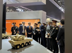 아랍에미리트(UAE) 군사 대표단이 21일 일산 킨텍스에서 열린 '서울 ADEX 2025' 한화 전시관을 찾아 한화그룹이 선보이고 있는 차륜형 장갑차에 대한 설명을 듣고 있다.