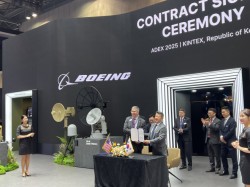 [포토] 보잉, 휴니드테크놀러지와 기술 협력 MOU체결미국의 대표적인 항공사인 보잉이 21일 일산 킨텍스에서 열린 '서울 ADEX 2025' 전시회에서 국내 방산업체인 휴니드테크놀러지와 기술 협약을 체결하고 있다.