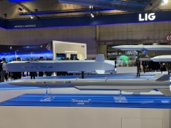 LIG넥스원이 21일 일산 킨텍스에서 열린 '서울 ADEX 2025'에서 KF-21가 운용하는 장거리 공대공 유도탄(LRAAM)과 멀티표적크루즈 미사일(L-MCM) 등 공대공·공대지·공대함 미사일을 전시하고 있다.