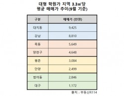 서울 강남구 대치동, 양천구 목동 등 학원가 인근에 위치한 아파트가 자치구 평균보다 2~3억원 비싼것으로 나타났다. 13일 부동산R114 자료에 따르면, 9월 기준 대치동 아파트 3.3㎡당 평균 매매가는 9425만원으로, 강남 평균(8810만원) 보다 3.3㎡당 615만원 비싸다. 전용 84㎡(구 34평) 기준으로 환산하면 2억 이상 차이가 난다. 대치동 내에서도 학원가와 가까울수록 높은 매매가격을 형성하고 있다. 래미안대치팰리스1단지, 대치..