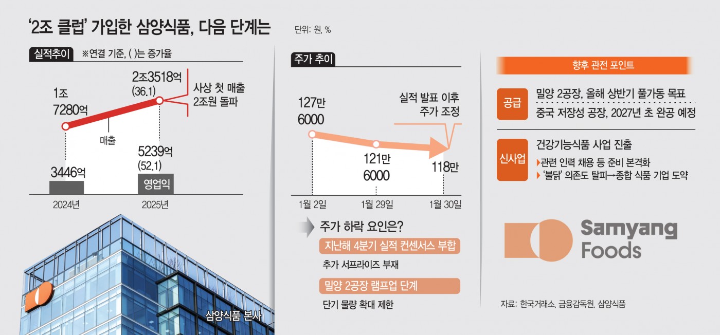 전 세계적인 '불닭' 열풍에 삼양식품이 사상 처음으로 매출 2조원 시대를 열었지만, 주가는 오히려 뒷걸음질 치며 숨 고르기에 들어간 모습이다. 시장에서는 단기 공급 변수와 주주가치 제고 전략의 부재, 여기에 '불닭' 단일 브랜드 의존까지 겹친 구조적 한계를 원인으로 지목하고 있다.1일 금융감독원에 따르면 삼양식품은 지난해 연결 기준 매출액 2조3518억원, 영업이익 5239억원을 기록했다고 잠정 공시했다. 전년 대비 매출은 36.1%, 영업이..