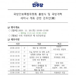 지난 25일 오후 1시부터 오후 4시까지, 성남 이다지오 스튜디오에서 열린 더불어민주당 국방안보특위의 집행부 회의는 그 자체로 여러모로 주목할 만한 정치적 시그널을 던졌다. 본지 취재에 따르면, 이날 회의는 공동위원장인 백군기·김도균 전의원이 주관한 가운데 출범 일정 및 행사 내용, 그리고 위원회 세부 구성 및 활동 방향 등이 논의됐다.표면적으로는 '출범식' 일정과 행사 구성, 위원회 내부 운영 방향으로 회의가 진행된 것으로 보인다. 하지만 그..