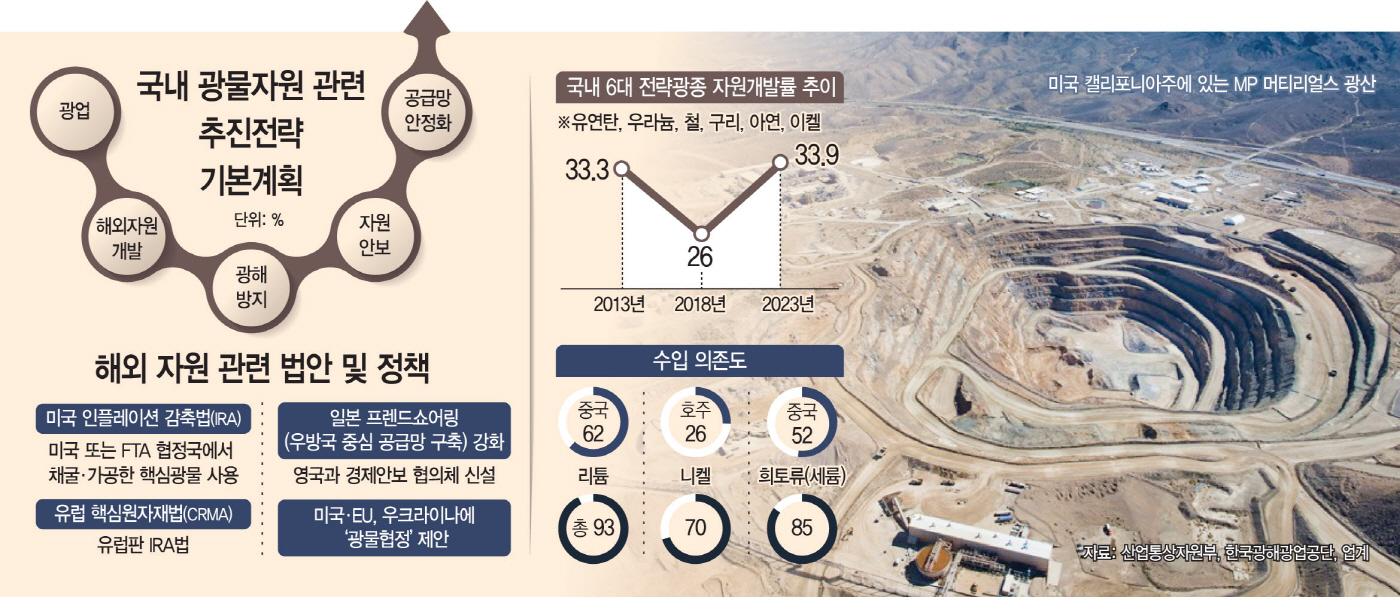 자원개발률의 정체기는 우리나라 자원안보 위기를 키우고 있다는 지적이다. 흔히 핵심광물로 불리는 희토류·리튬·니켈 등 금속광은 현재 국내 부존자원 고갈 등으로 해외 수입에 의존할 수밖에 없다. 실제 2023년 말 기준 전체 광물 해외수입의존도는 95.5%다. 특히 광물별로 보면 특정국가에 치중돼 있다. 공급망을 다변화해야 하는 이유다. 일례로 10대 전략 핵심광물 중 하나인 리튬의 경우 중국 수입 비중이 62%에 달한다. 다시 말해 중국에서 리튬 수출 통제에 나서면 리튬을 필수로 쓰는 배터리 산업은 큰 타격을 입을 수밖에 없는 셈이다.