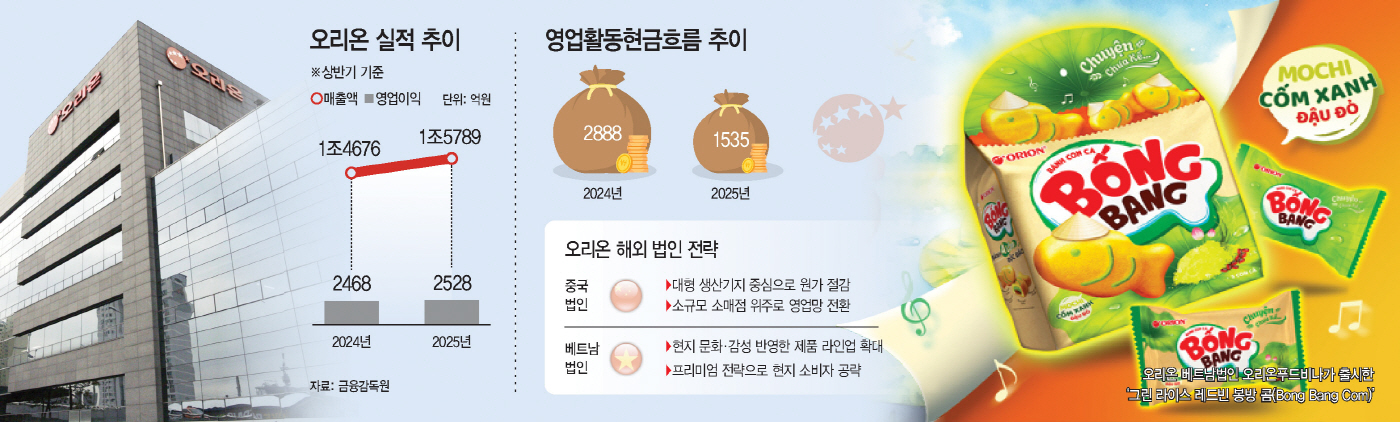 오리온이 상반기 성장세에도 영업활동 현금흐름이 감소세를 보였다. 매출이 크게 발생하는 중국, 베트남 명절의 시점 차이와 지난해 거래처 대금 지급 이월, 해외 시장 공략을 위한 마케팅 비용 증가 등이 주요 원인으로 꼽힌다. 시장에선 이를 일시적 조정으로 평가하며 내년부터 원가 안정화와 함께 실적 개선이 본격화할 것으로 전망했다.