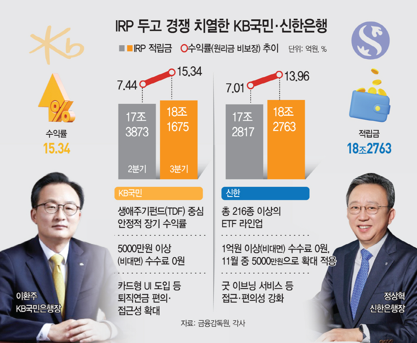 반면 IRP 수익률은 KB국민은행이 신한은행을 앞섰다. 3분기 수익률(원리금 비보장)은 15.34%로 신한은행보다 1.38%포인트 높았다. 주식시장 호재 등으로 양사 모두 2분기보다 수익률이 개선됐지만, KB국민은행 개선 폭이 신한은행보다 0.95%포인트 더 컸다.