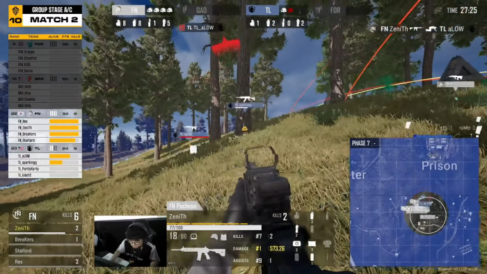 FN 포천은 첫 자기장이 랜드마크에서 먼 곳으로 잡히자 비상호출을 이용해 과감히 중앙으로 이동했다. 이후 페이즈 클랜과의 교전에서도 밀리지 않으며 7페이즈까지 풀 스쿼드를 유지했고 결국 포레스트 네이처 게이밍과 팀 리퀴드를 연이어 제압해 8킬 치킨을 완성했다.