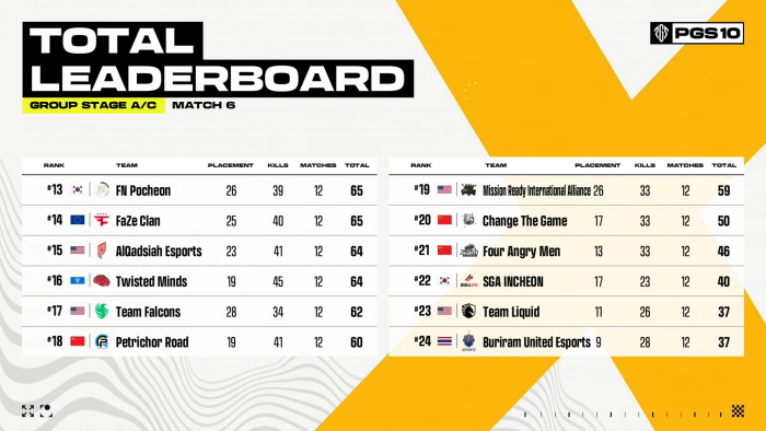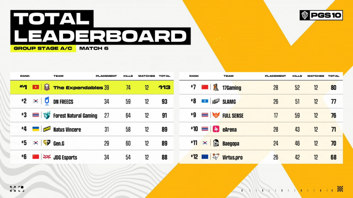 그중 DN 프릭스는 시즌 9의 아쉬움을 완벽히 만회했다. 초반부터 치킨과 연속 득점으로 전체 1위에 오르며 일찌감치 파이널행을 확정했다. 젠지는 마지막 날까지 치열한 경쟁 속에서도 안정적인 교전 능력을 선보이며 5위를 기록, 시즌 9 4위 이상의 성적을 노릴 수 있는 발판을 마련했다. 배고파 역시 꾸준한 득점력으로 상위권 자리를 지켜냈다.