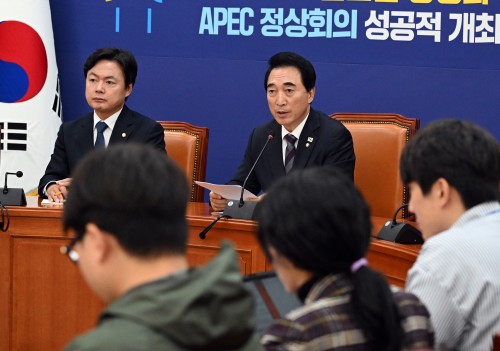 박수현 더불어민주당 수석대변인이 2일 국회에서 국정감사 및 현안 관련 기자간담회를 하고 있다. /송의주 기자