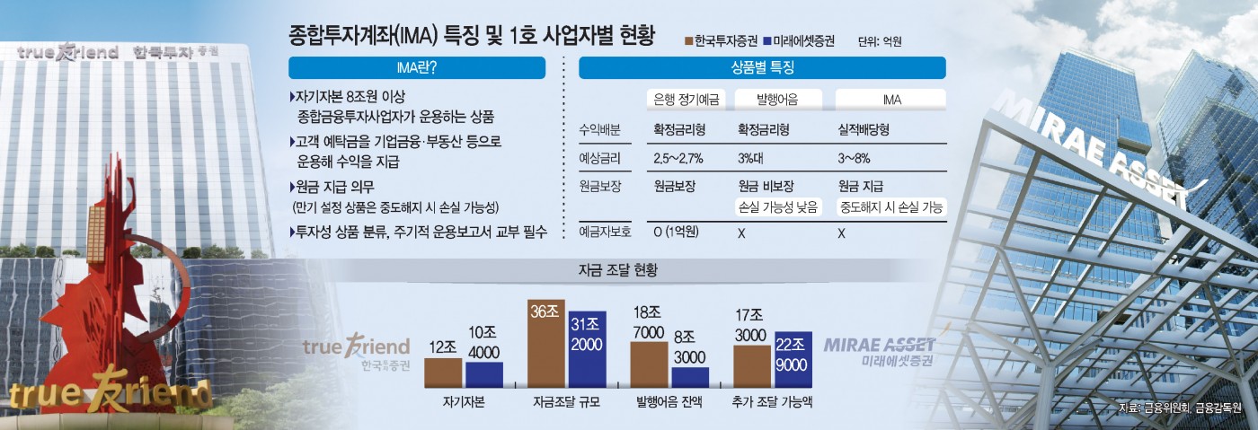 자금 조달을 위해 두 회사는 다음 달 중 종합투자계좌(IMA) 출시에 나선다. IMA는 계좌 전체의 70% 이상을 만기 1년 이상 자산으로 운용하는 원금지급형 계좌다. 그간 은행과 달리 예금 기능이 없었던 증권사 입장에선 고객으로부터 대규모 자금을 얻을 수 있다는 장점이 있고, 고객은 은행보다 더 높은 수익률을 원금보장 형태로 보장받을 수 있다는 점에서 일석이조인 상품이다. 발행어음은 자기자본의 200%까지 운용할 수 있지만, IMA사업자는 100% 추가해 총 300%까지 운용이 가능하기 때문에 수익성 확대에 유리할 수밖에 없다.