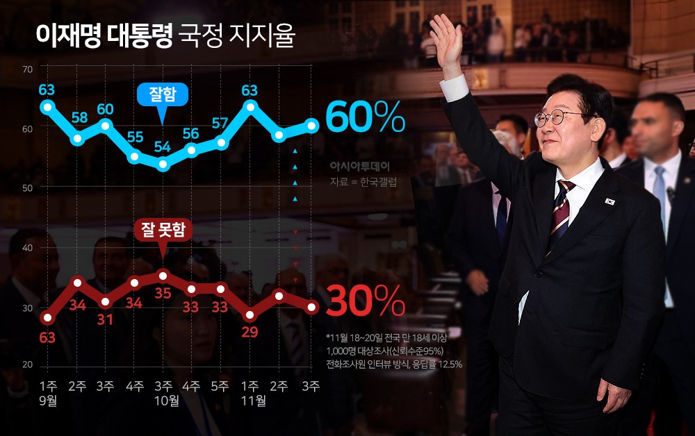 이 대통령 지지율은 10월 말 아시아태평양경제협력체(APEC) 정상회의, 한미정상회담 성과 등에 힘입어 11월 첫째 주 63%를 기록했으나 한 주 만에 4%p 떨어지며 지난 주 59%를 기록했다.