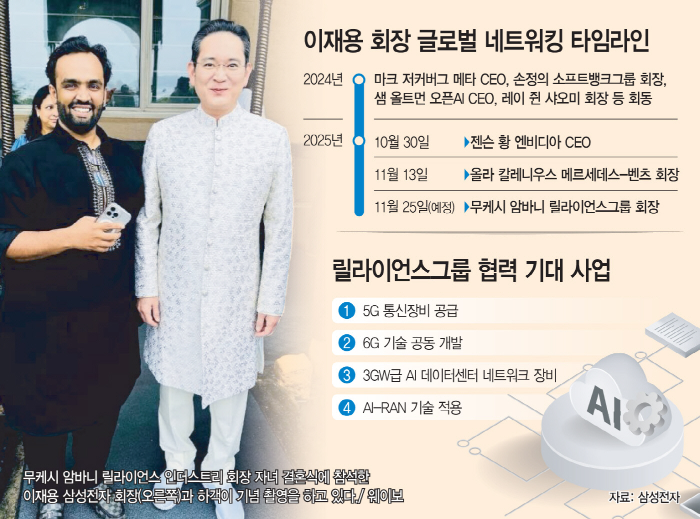이재용 삼성전자 회장이 인도 최대 갑부 무케시 암바니 릴라이언스그룹 회장과의 회동을 통해 네트워크 사업 재도약의 계기를 마련할 수 있을지 주목된다. 젠슨 황, 올라 칼레니우스에 이어 암바니까지 연이은 글로벌 네트워킹이 '뉴삼성'의 실질적 성과로 이어질지가 관건이다.