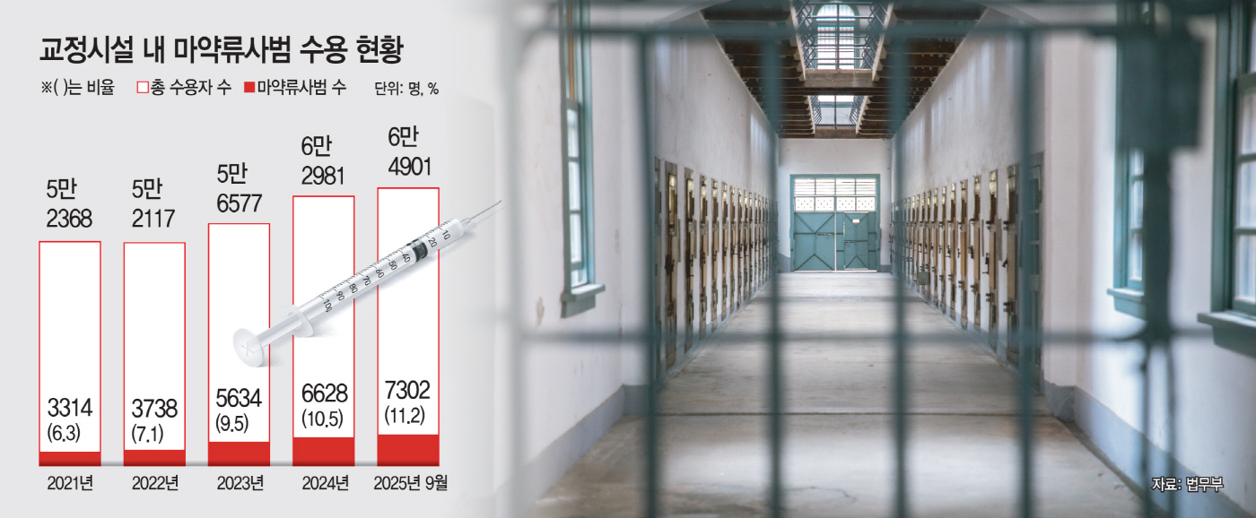 폭증한 마약사범은 교정 부담으로 이어졌다. 아시아투데이가 법무부 교정본부로부터 확보한 자료에 따르면 전국 교정시설 내 마약사범은 2021년 3314명(전체의 6.3%)에서 2022년 3738명(7.1%), 2023년 5634명(9.5%), 2024년 6628명(10.5%)으로 매년 증가했다. 2025년 9월 기준으로는 7302명으로 전체 수용자 6만4901명 중 11.2%를 차지했다. 불과 5년 만에 두 배 이상 늘며, 교정시설 수용자 10명 중 1명이 마약사범인 나라가 돼버렸다.