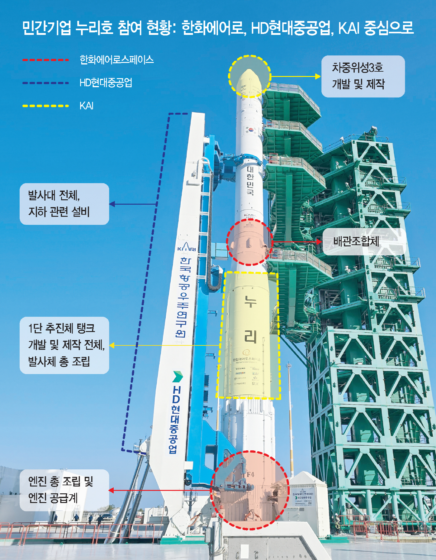 성공적으로 마무리된 한국형 발사체 누리호의 4차 발사는 민간이 주도했다는 점에서 의미가 깊다. 한화에어로스페이스가 제작을 총괄 주관했고, HD현대중공업이 발사대시스템을 총괄 운용했다. 한국항공우주산업(KAI)은 누리호에 실린 차세대중형위성 3호를 총괄 주관 개발했다. 이 외에도 누리호 제작에는 300여개 기업이 참여했으며, 한화에어로가 이 기업들을 관리하는 '체계종합기업' 역할을 맡았다.