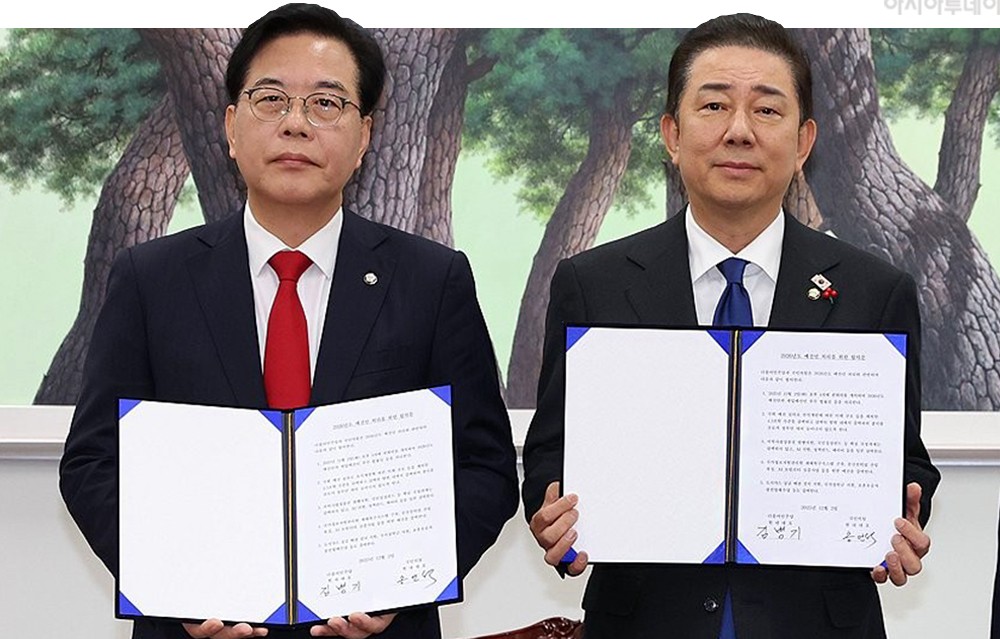| 국민의힘 송언석 원내대표(왼쪽), 더불어민주당 김병기 원내대표(오른쪽)이 2일 서울 여의도 국회에서 2026년도 예산안 처리를 위한 합의문에 서명을 마치고 기념 촬영하고 있다./연합 |