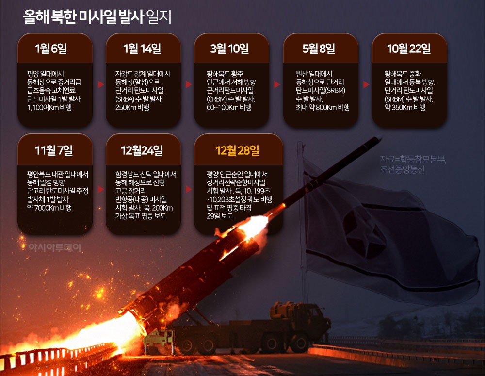 조선중앙통신에 따르면 북한은 전날인 28일 장거리 전략순항미사일들을 발사했다. 통신은 "미사일들은 각각 1만 199초, 1만 203초 간 설정된 비행궤도를 따라 비행한 뒤 표적을 명중 타격"했다고 보도했다.