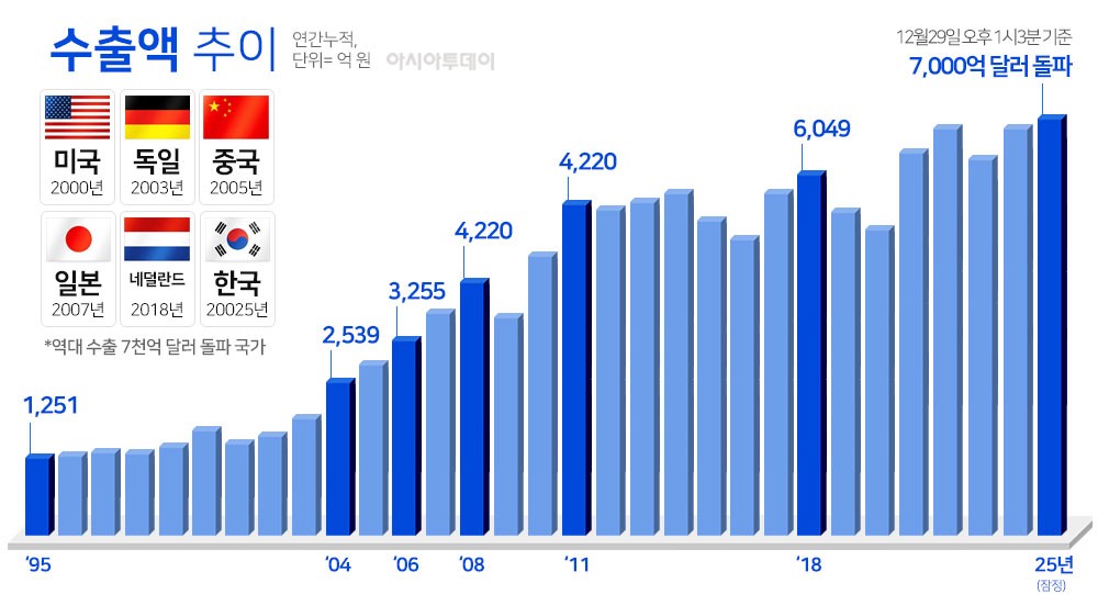 한국 수출이 사상 처음으로 연간 7000억 달러를 넘어섰다. 2018년 6000억 달러를 돌파한 이후 7년 만의 성과로, 글로벌 주요국 가운데 6번째로 해당 기록을 달성했다.