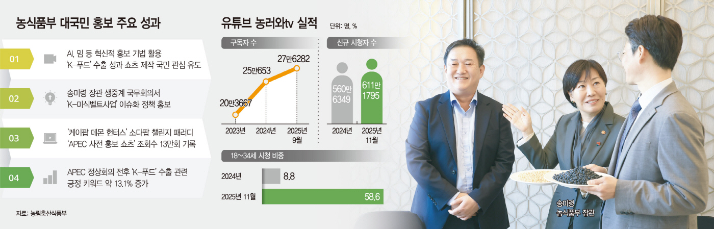 농식품부의 AI, 밈 등 혁신적 홍보 기법을 활용해 수출 성과를 소개하는 쇼츠는 MZ세대로부터 큰 박수를 받았다. 실제 지난해 AI 활용(7월 7일)·밈 활용(11월 10일) 쇼츠는 조회수 58만7000회, 좋아요 8400개를 기록했다.