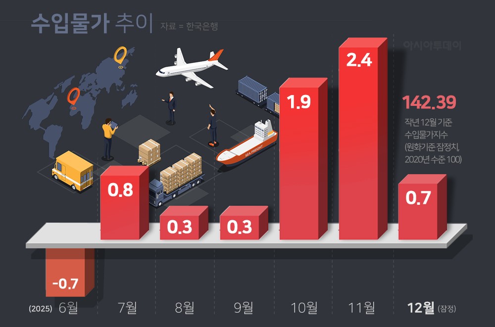 한국은행이 14일 발표한 수출입물가지수 통계에 따르면 작년 12월 기준 수입물가지수(원화기준 잠정치, 2020년 수준 100)는 142.39를 기록해 전월(141.47) 대비 0.7% 상승했다. 수입물가지수가 6개월 연속 오른 건 지난 2021년 5월~10월 이후로 4년 2개월 만이다.