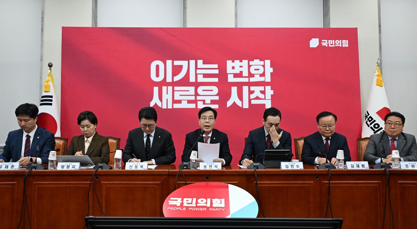 | 송언석 국민의힘 원내대표(가운데)가 26일 국회에서 열린 최고위원회의에서 발언을 하고 있다. /송의주 기자 |