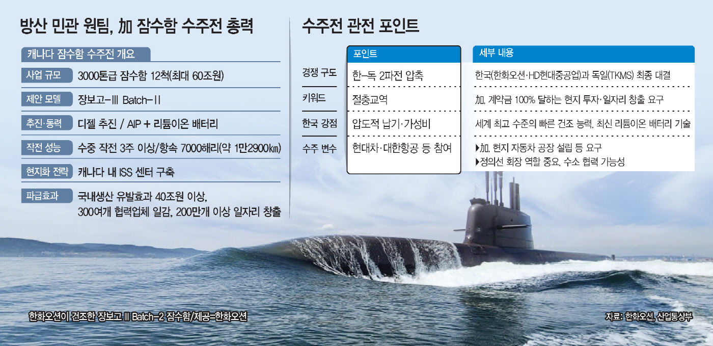 한화오션은 이번 사업에 핵추진 잠수함을 제외한 디젤 추진 잠수함 가운데 최상급 성능으로 평가받는 '장보고-Ⅲ 배치(Batch)-Ⅱ'를 제안했다. 3주 이상 수중 작전이 가능하며, 최대 7000해리(약 1만2900㎞) 항속 거리를 확보해 태평양과 대서양, 북극해까지 아우르는 캐나다 해군의 작전 환경에 적합하다는 평가를 받는다.