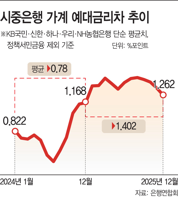 하지만 지난 한 해를 통틀어 보면 이들 은행의 예대금리차는 전년 대비 확대됐다. 5대 은행의 지난해 1~12월 평균 가계 예대금리차(정책서민금융 제외)는 1.402%포인트로, 2024년(0.777%포인트)보다 약 0.63%포인트 커졌다. 연중 내내 1%포인트를 웃도는 예대금리차가 이어진 셈이다. 같은 기간 평균 가계대출 금리는 4.24%에서 4.11%로 큰 변동이 없었던 반면, 저축성 수신금리가 3.46%에서 2.71%로 0.75%포인트 급락한 영향이 컸다. 사실상 기준금리 인하 국면에서 예금금리만 하향 조정한 셈이다.