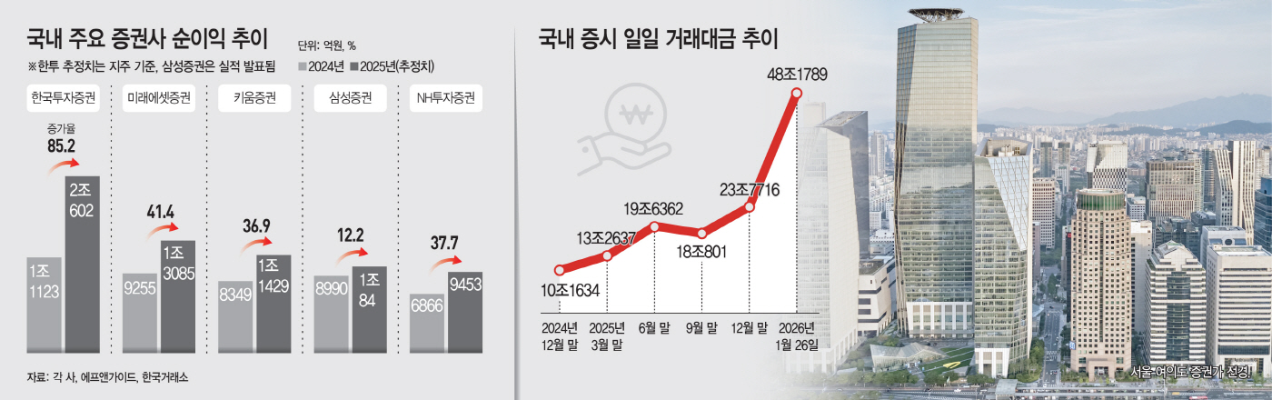 실적 폭등의 핵심에는 코스피 급등에 따른 활발한 거래 흐름이 자리하고 있다. 코스피 지수가 5000포인트를 향해 가파르게 상승하는 동안 개인 투자자들이 대거 시장에 뛰어들었고, 주식 거래대금이 1년새 4배 이상으로 늘어났다. 상법 개정과 주가조작 근절이라는 투트랙 정책도 증시 랠리의 기반이 됐다.