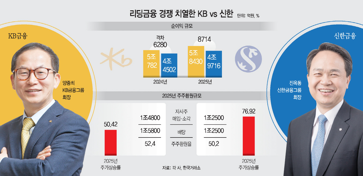 다만 양사의 순이익 격차는 2024년 6280억원보다 더 커진 7394억원으로 나타났다. 환율·금리 변동성·정책 이슈 등 경영 환경을 둘러싼 변수가 확대되는 가운데, KB금융이 보유한 은행과 비은행의 균형 잡힌 포트폴리오가 긍정적으로 작용했다는 평가다.